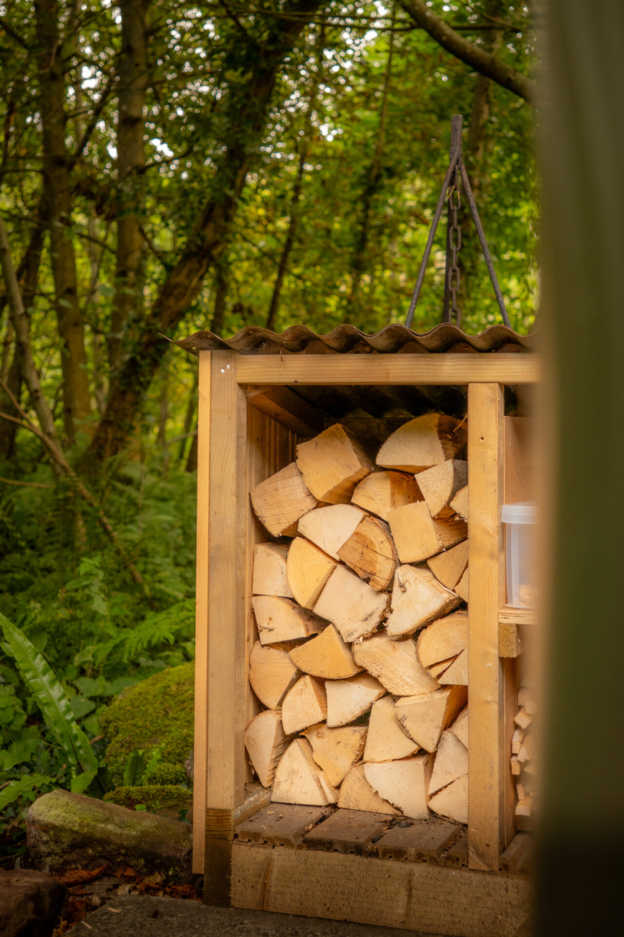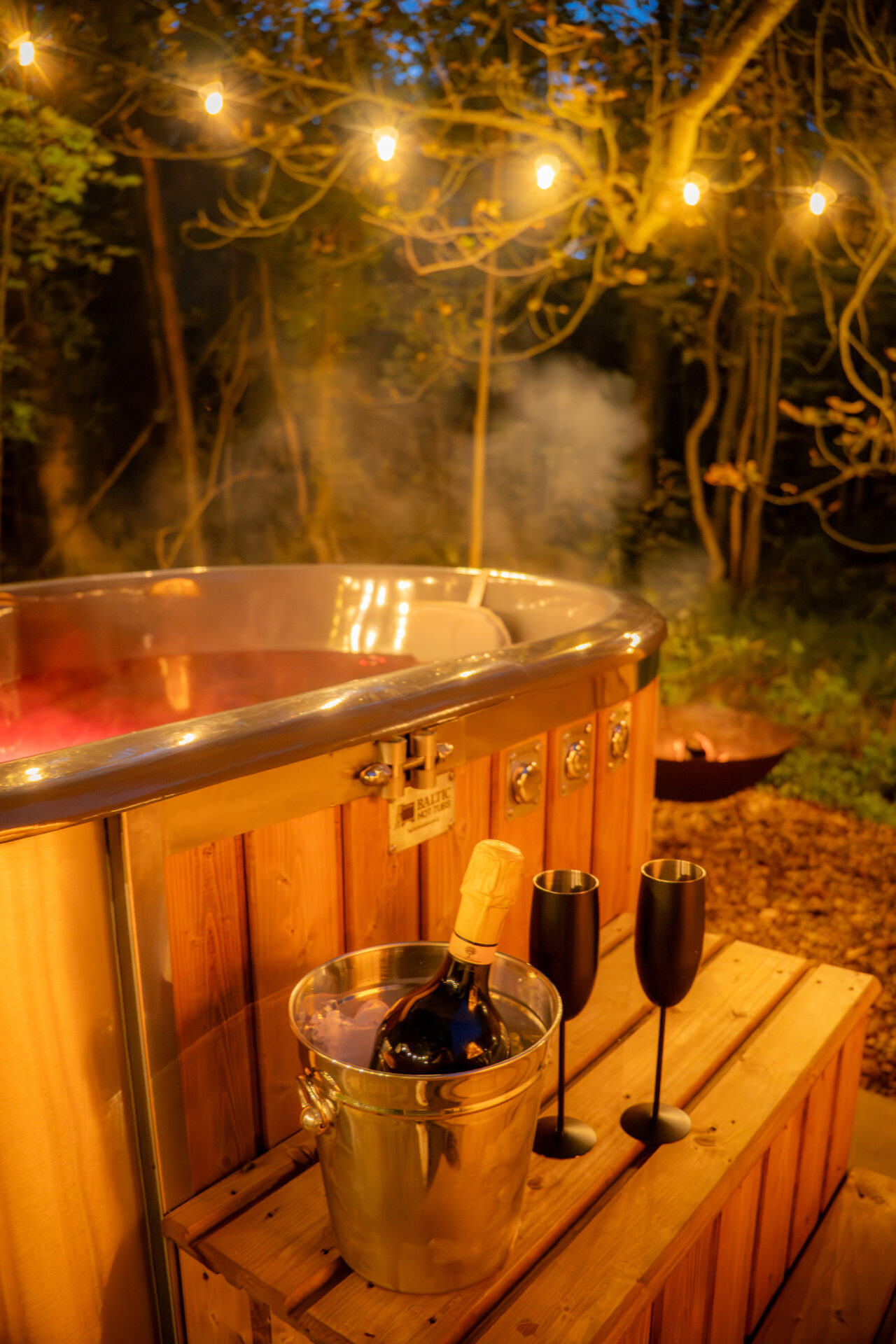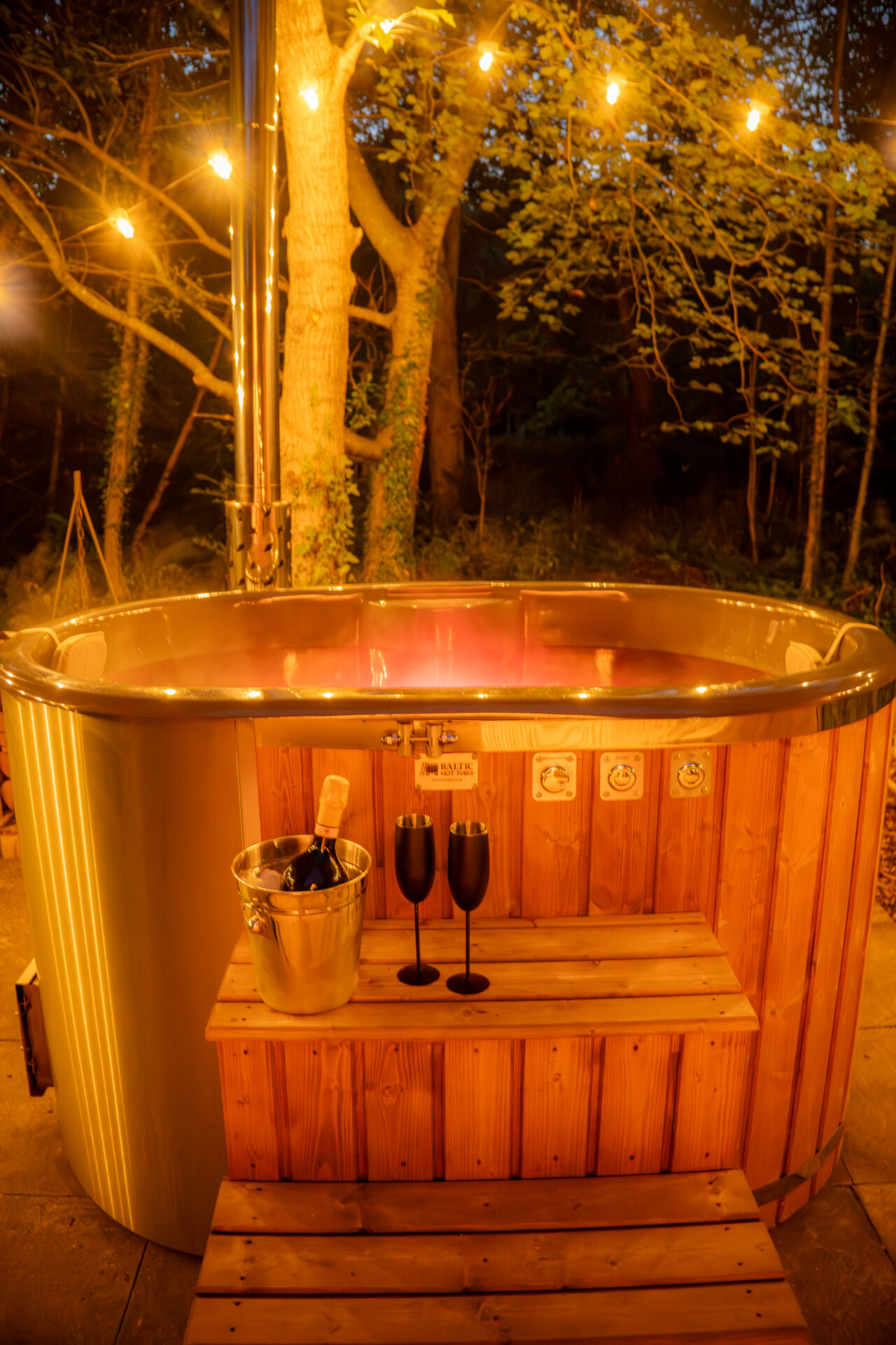 A beautiful woodland setting, birdsong all day and nature literally at your doorstep. The area is not fenced in so we ask guests to keep dogs close by. There is a firepit and a BBQ and a wood fired hot tub that more than comfortably sits 2 people. The hot tub also had LED lights and Hydro Jets to massage your weary muscles!