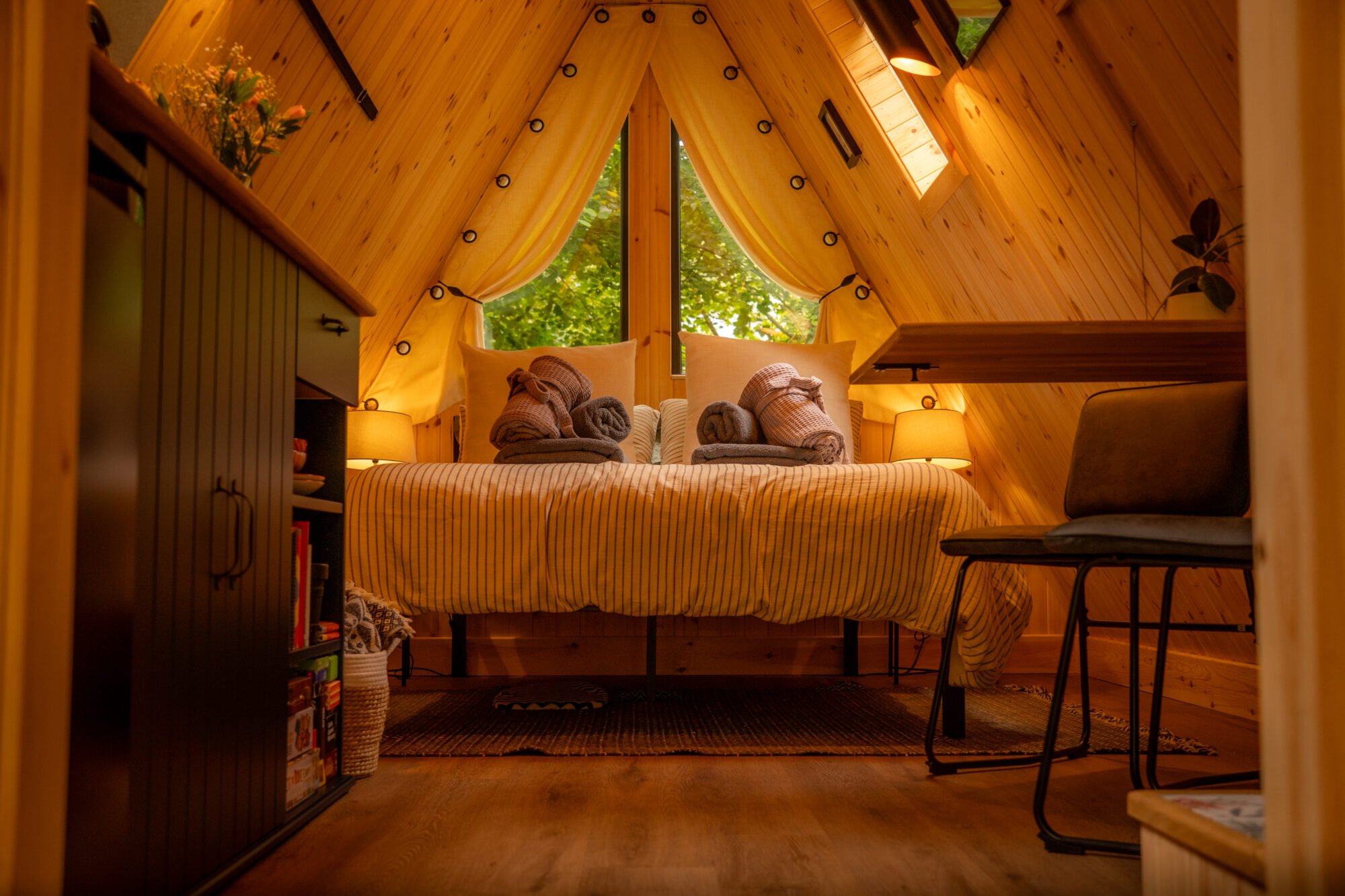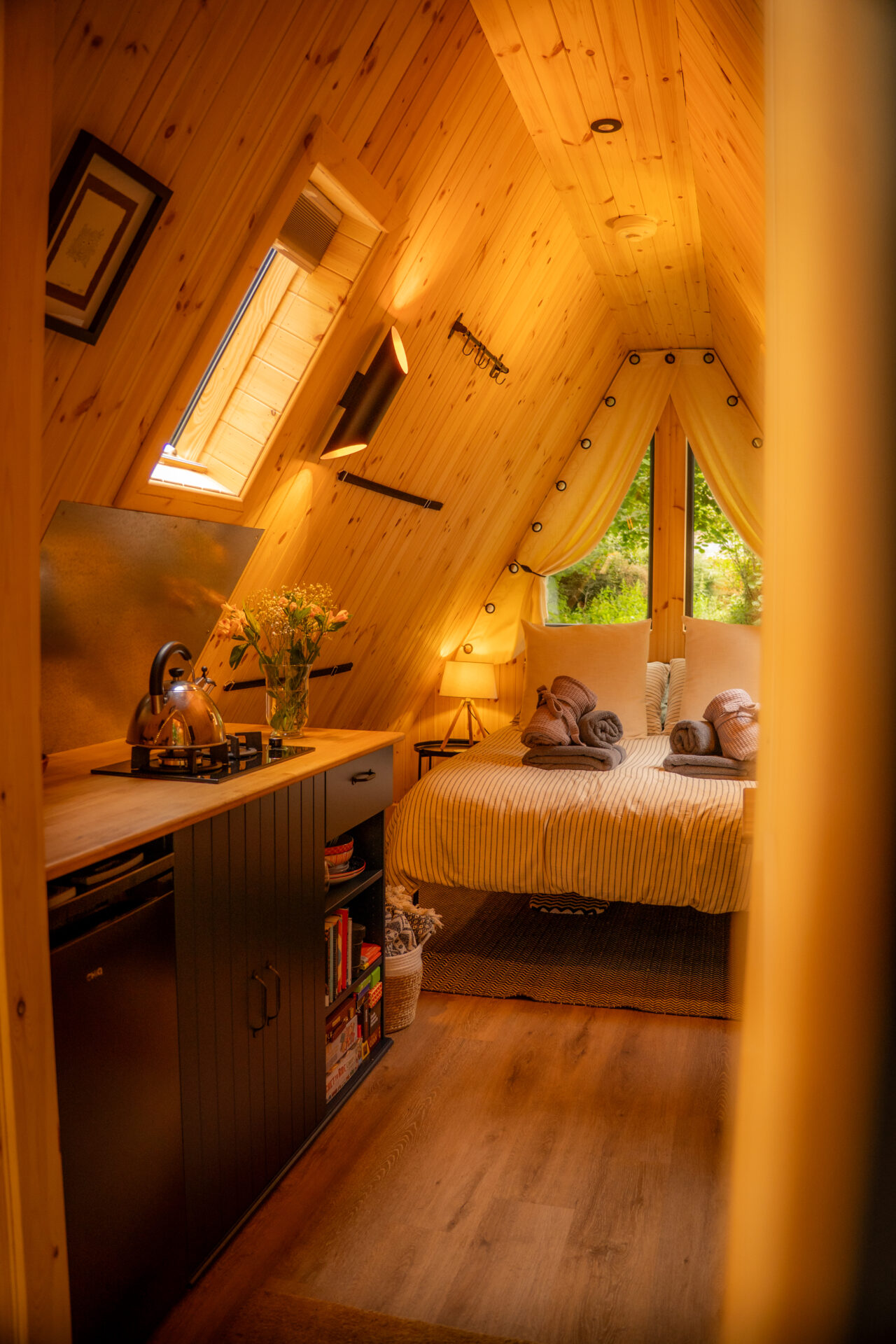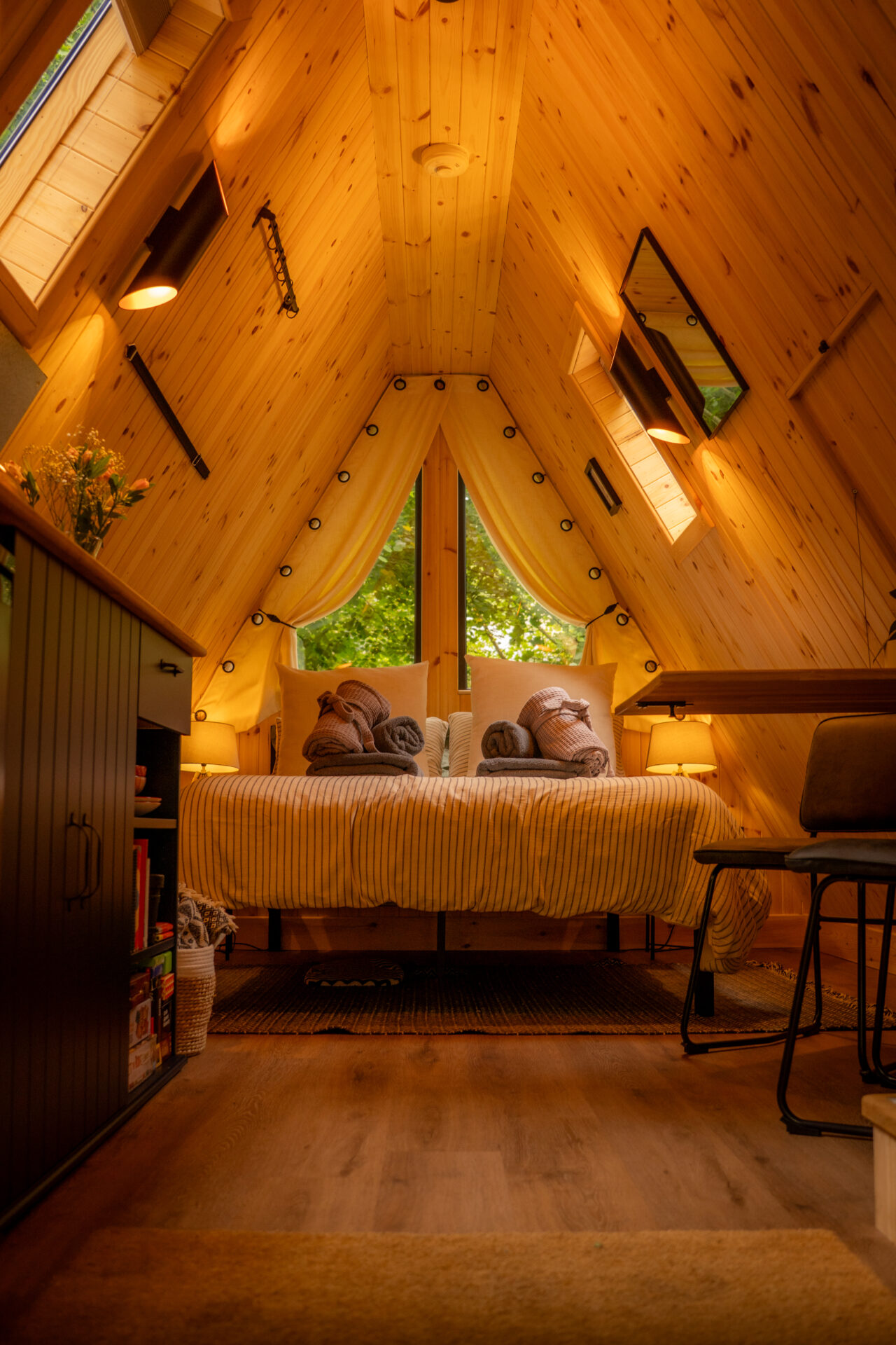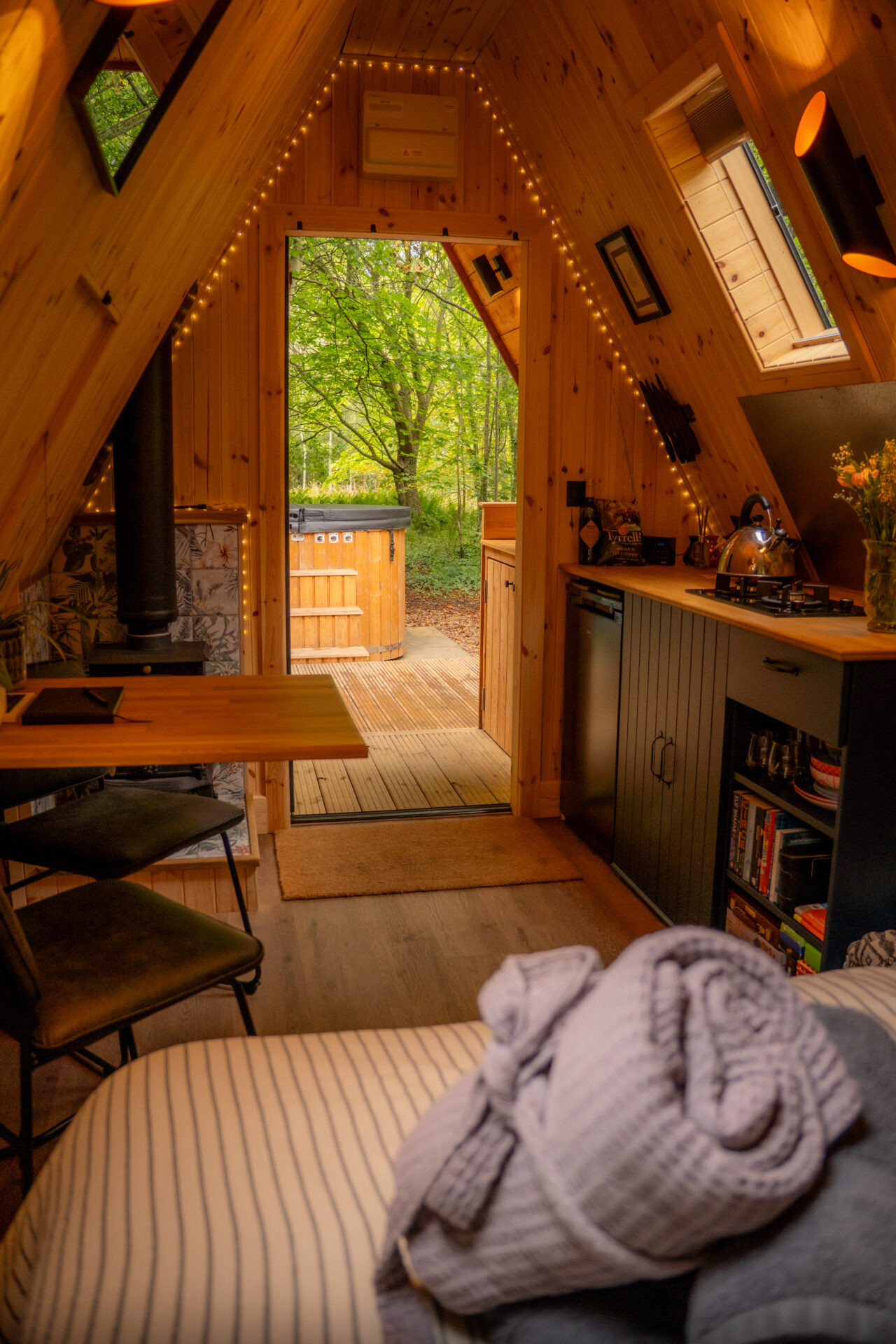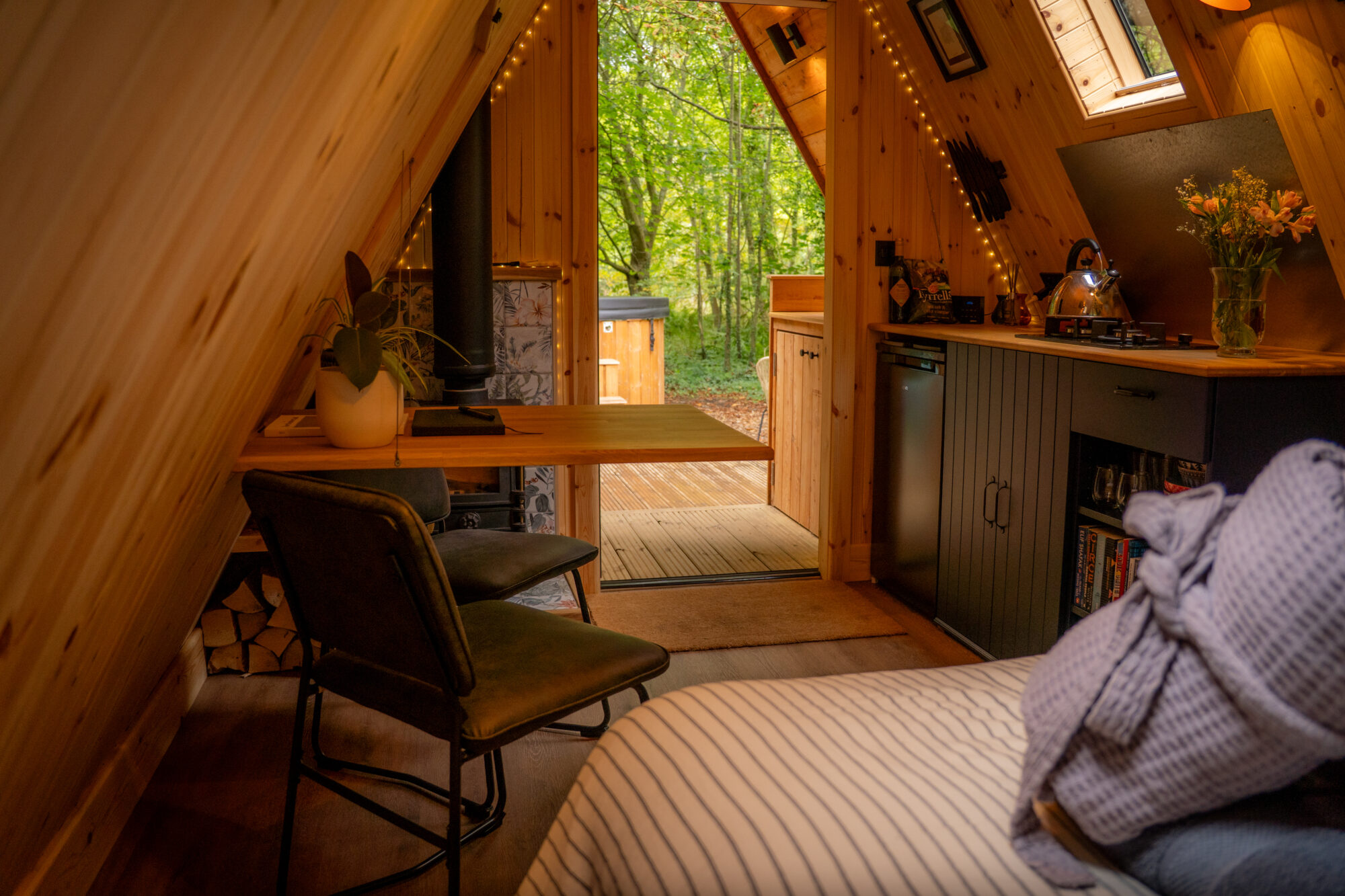 In 2019 Kirsten moved to Preston to run The Joiners Shop Bunkhouse, and lives on site with partner Ross. During Covid Kirsten decided to build an escape retreat, known as ‘the bell tent in the woods’,  which was a secluded woodland glamping experience beloved by many visitors. Fast forward to 2025 and we decided it was time to upgrade the bell tent experience to something more luxurious and year round. Ross has designed and built the entire A Frame Cabin we have named Hurkle Durkle Hut. Hurkle Durkle is an ancient Scottish Term meaning to lounge around long after it’s time to be up and about. We thought this rather fitting, Ross being a Scotsman himself combined with how relaxing this space is to enjoy.