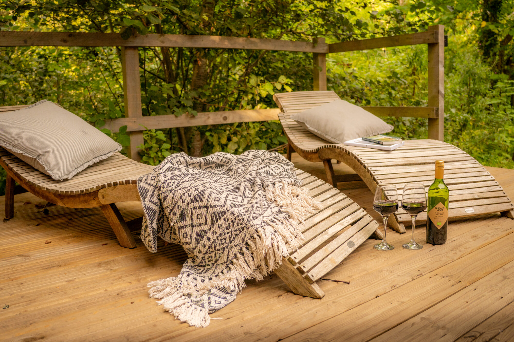 On the large decking area we have sun loungers, and a table and chairs for dining alfresco. There is also a compost loo and a hot gas powered shower. And of course, the wood fired hydro jet hot tub! The area is lit by festoon lighting and we have plans for some more winter lighting installments coming soon (Oct 2025).