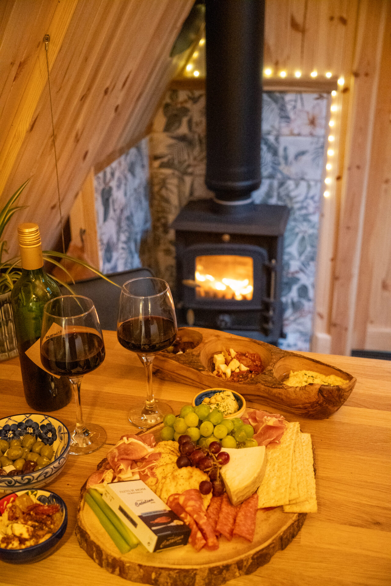 Inside the hut there is a King Sized bed with luxury bedding, a table and chairs, a stove to keep you warm and cosy in the winter months and a kitchenette with 2 gas ring burners and an undercounter fridge/freezer. We have supplied board games, all the crockery and cooking utensils you will need to enjoy a meal as well as a toaster. We also supply a number of herbs and spices, Salt & Pepper, Cooking Oil, Tea & Coffee and some complimentary extras. You have 2 towels each and a dressing gown, there’s also a hair dryer and coat hangers in case you need to hang up any evening attire.
